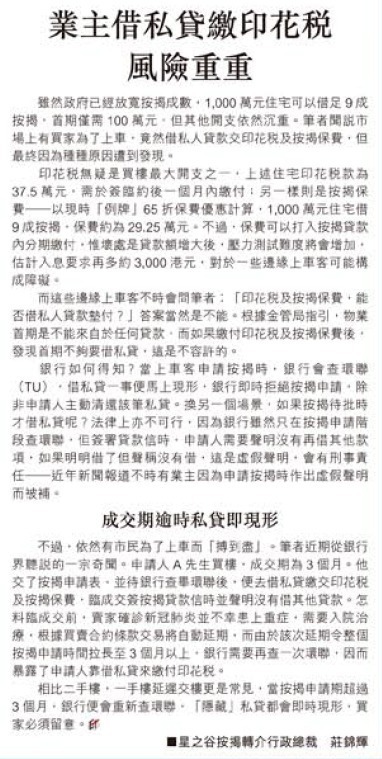 雖然政府已經放寬按揭成數,1,000万元住宅可以借足9成按揭,首期僅需100万元,但其他開支依然沉重。筆者聞說市場上有買家為了上車,竟然借私人貸款交印花稅及按揭保費,但最終因為種種原因遭到發現。